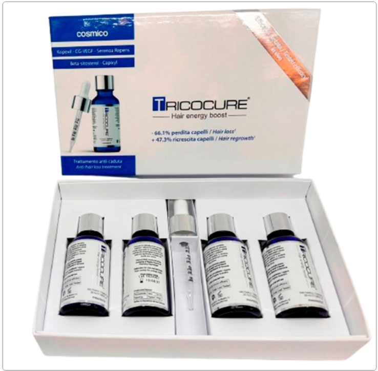 Tricocure is the most revolutionary and complete formula to reduce the main hair loss causes. The formula of Tricocure is enriched with numerous active ingredients: Vascular regrowth factor, Cutaneous microcirculation enhancer, 5-alpha reductase inhibitors and a pool of nutrients and restructuring ingredients are the Tricocure core.